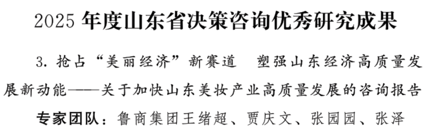 近日,山東省決策咨詢委員會發(fā)布《關(guān)于表揚2025年度山東省決策咨詢優(yōu)秀研究成果的通報》,對全省12項高質(zhì)量決策咨詢優(yōu)秀研究成果予以通報表揚。由魯商集團撰寫的研究報告《搶占“美麗經(jīng)濟”新賽道 塑強山東經(jīng)濟高質(zhì)量發(fā)展新動能——關(guān)于加快山東美妝產(chǎn)業(yè)高質(zhì)量發(fā)展的咨詢報告》成功入選,榮獲省級表彰。