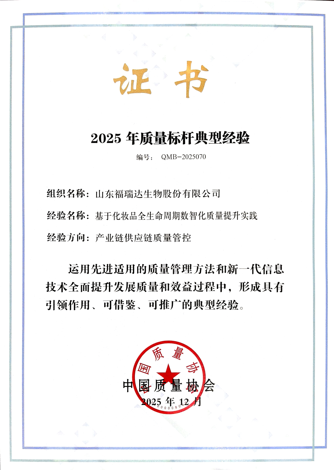 為助力培育產(chǎn)品卓越、品牌卓著、創(chuàng)新領(lǐng)先、治理現(xiàn)代的世界一流企業(yè),2025年中國(guó)質(zhì)量協(xié)會(huì)持續(xù)開(kāi)展質(zhì)量標(biāo)桿典型經(jīng)驗(yàn)征集與交流活動(dòng)。活動(dòng)嚴(yán)格遵循《質(zhì)量標(biāo)桿典型經(jīng)驗(yàn)征集管理辦法》,經(jīng)過(guò)多輪嚴(yán)格篩選,最終從質(zhì)量管理數(shù)字化、質(zhì)量管理模式變革、質(zhì)量管理推進(jìn)機(jī)制建立、產(chǎn)業(yè)鏈供應(yīng)鏈質(zhì)量管控等多個(gè)關(guān)鍵領(lǐng)域,評(píng)選出74項(xiàng)具有示范引領(lǐng)作用的典型經(jīng)驗(yàn),福瑞達(dá)生物股份的實(shí)踐經(jīng)驗(yàn)在產(chǎn)業(yè)鏈供應(yīng)鏈質(zhì)量管控方向脫穎而出。