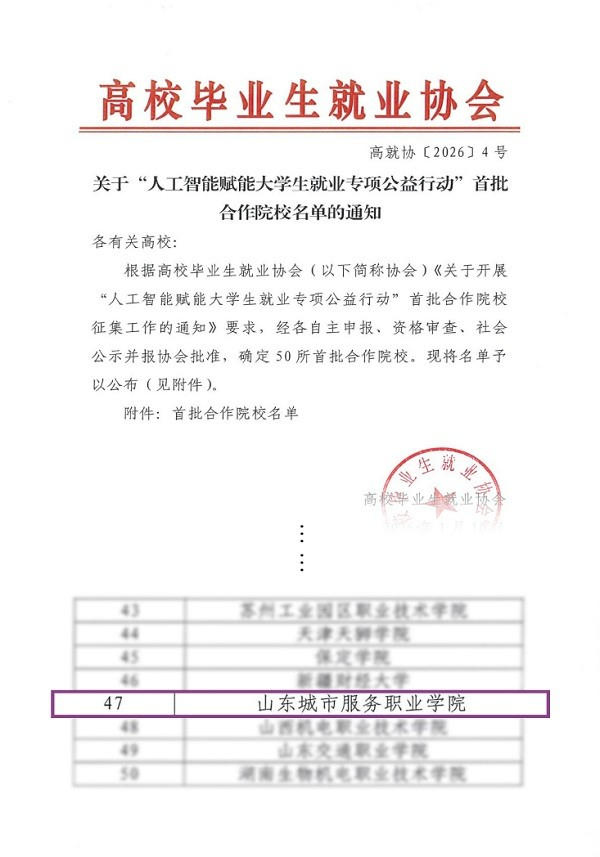 近日,高校畢業(yè)生就業(yè)協(xié)會(huì)正式公布“人工智能賦能大學(xué)生就業(yè)專項(xiàng)公益行動(dòng)”首批合作院校名單,山東城市服務(wù)職院憑借扎實(shí)的就業(yè)工作基礎(chǔ)、創(chuàng)新的就業(yè)服務(wù)模式及顯著的就業(yè)工作成效,成功入選,成為全國(guó)首批、區(qū)域領(lǐng)先的獲選院校之一。